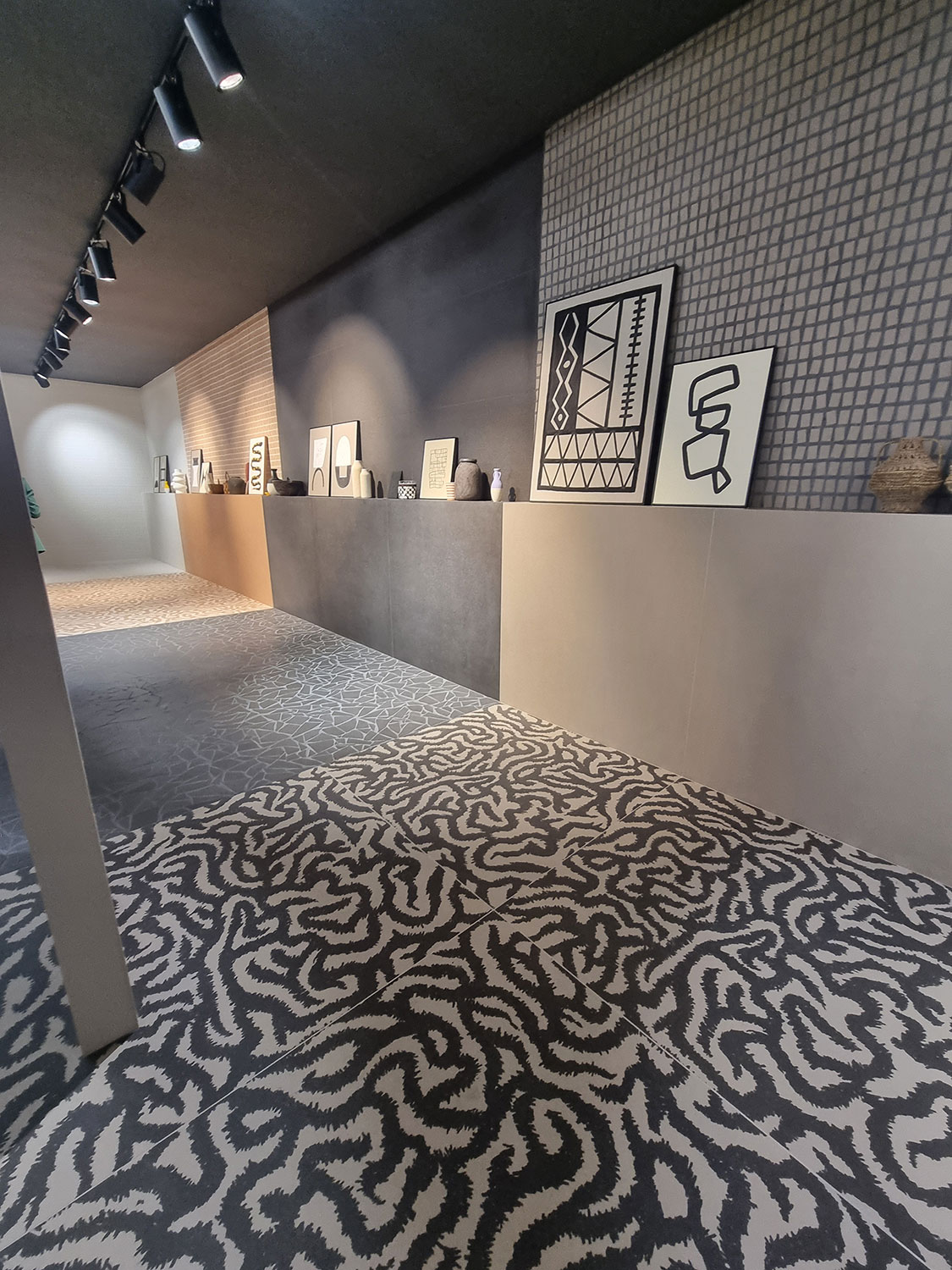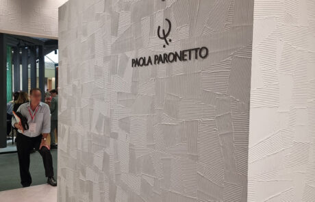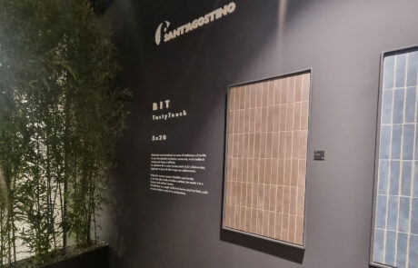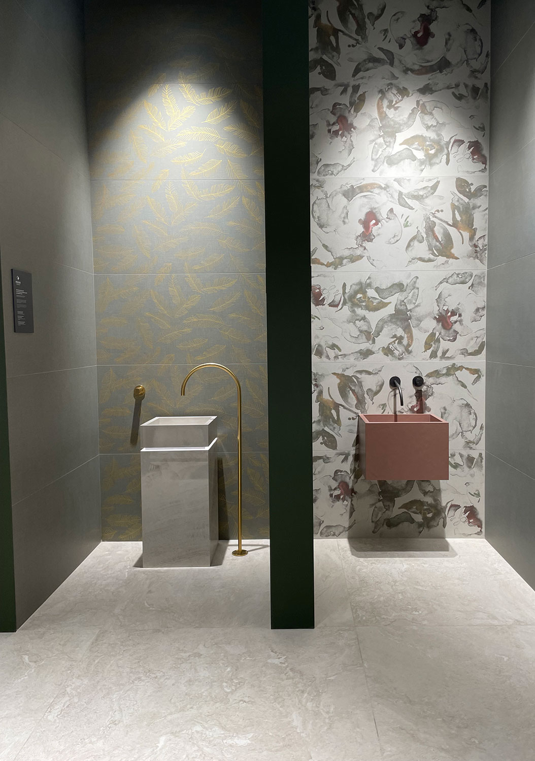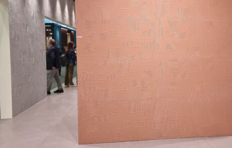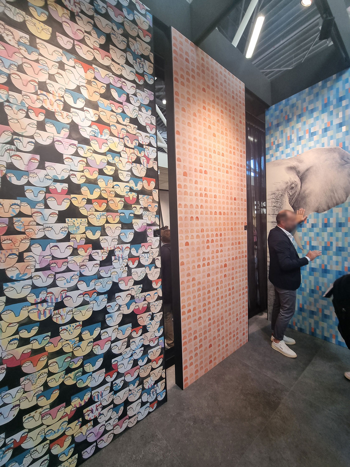 The original covering with spatula reliefs Homey Paper Clay – by Piemme with Paola Peronetto stands out, taking up the ceramic materiality of its design objects (vases and lamps) present on the stand to accompany (walk together with) the covering. Also highlighted is Nok, an articulated and original proposal by 41042, sizes from 120×120 and below, between 2 textured backgrounds, ethno-animalier graphics and disruptive mosaics.