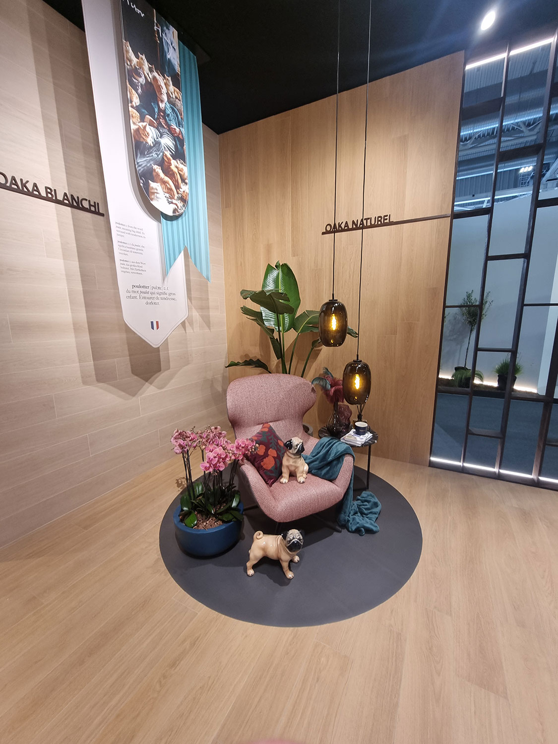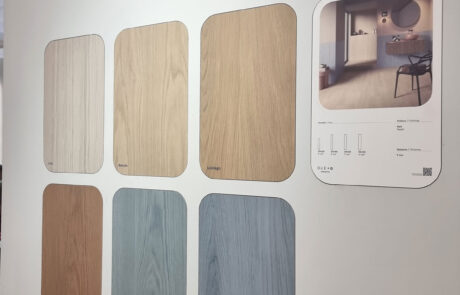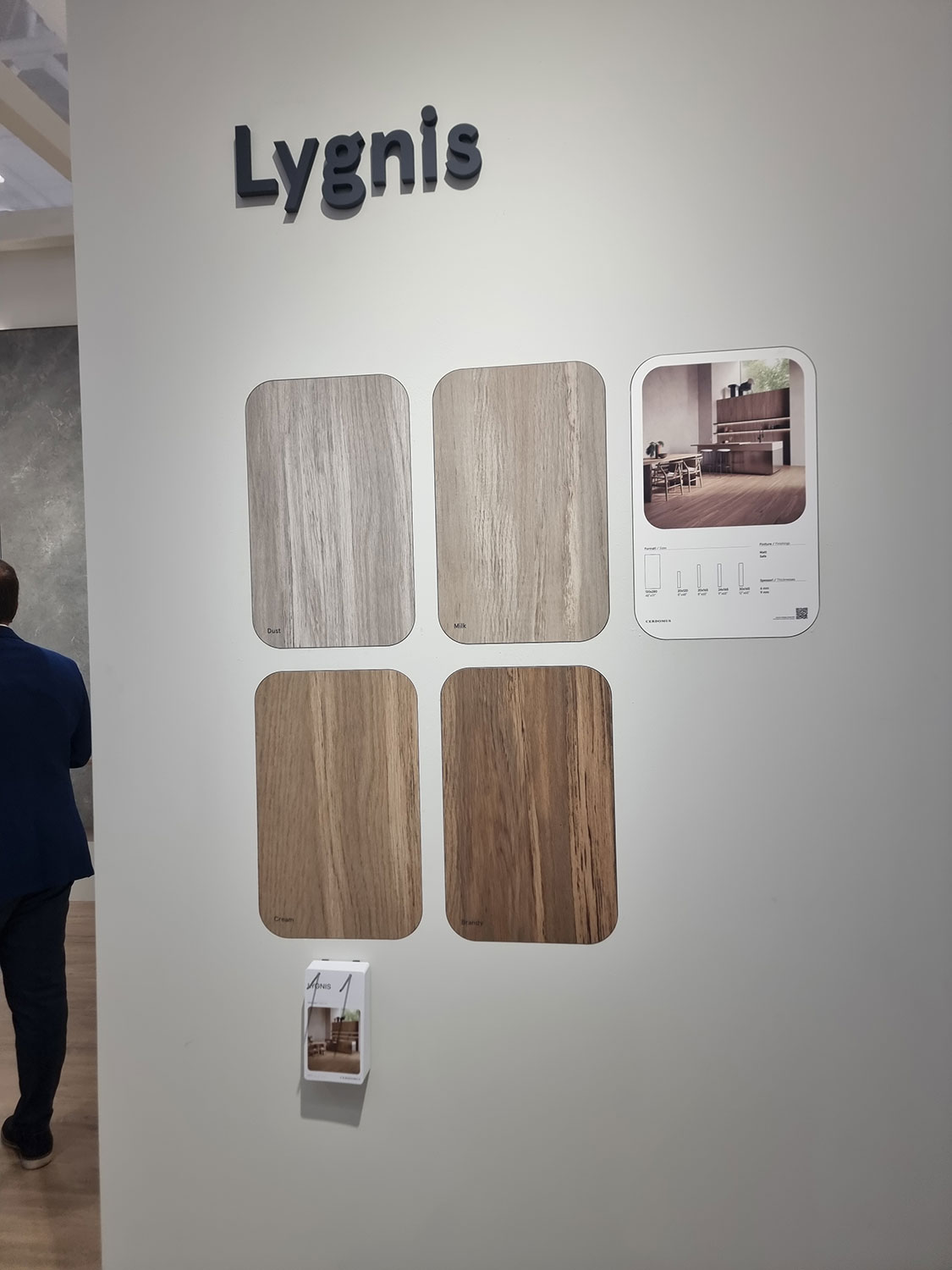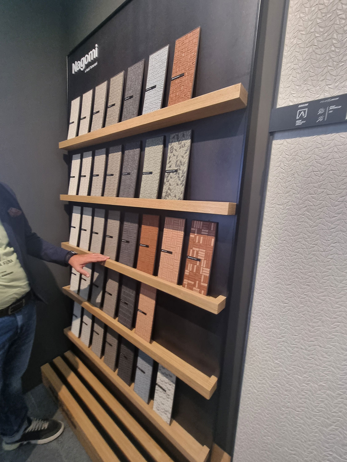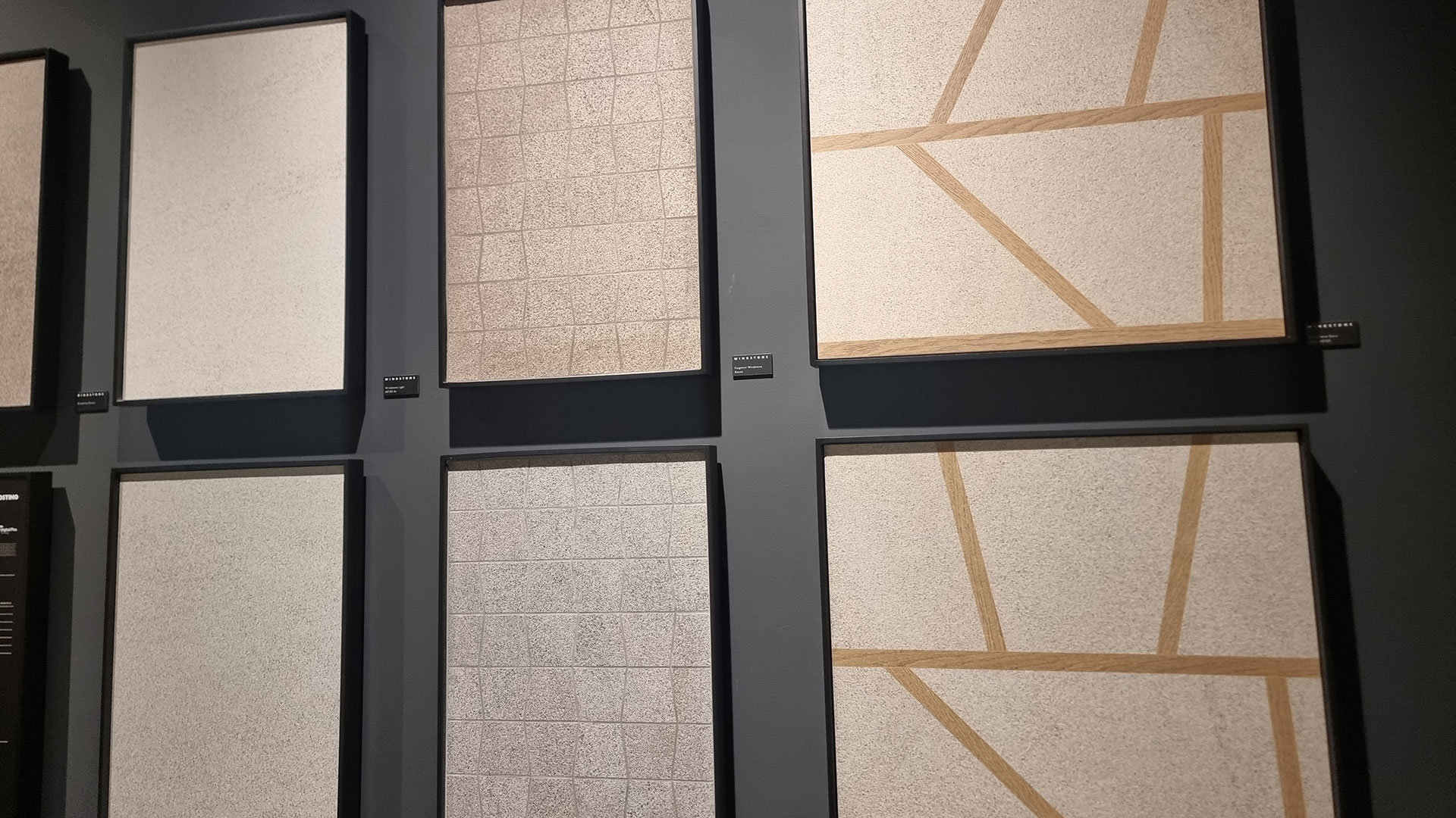 In the general calm, Mirage plays the heavy load: ReSource, with over 60% pre-consumer recycled material. Plenty of space in the stand for an important range with 8mm thickness. If the product gets going, it will be necessary to find enough waste to recycle.