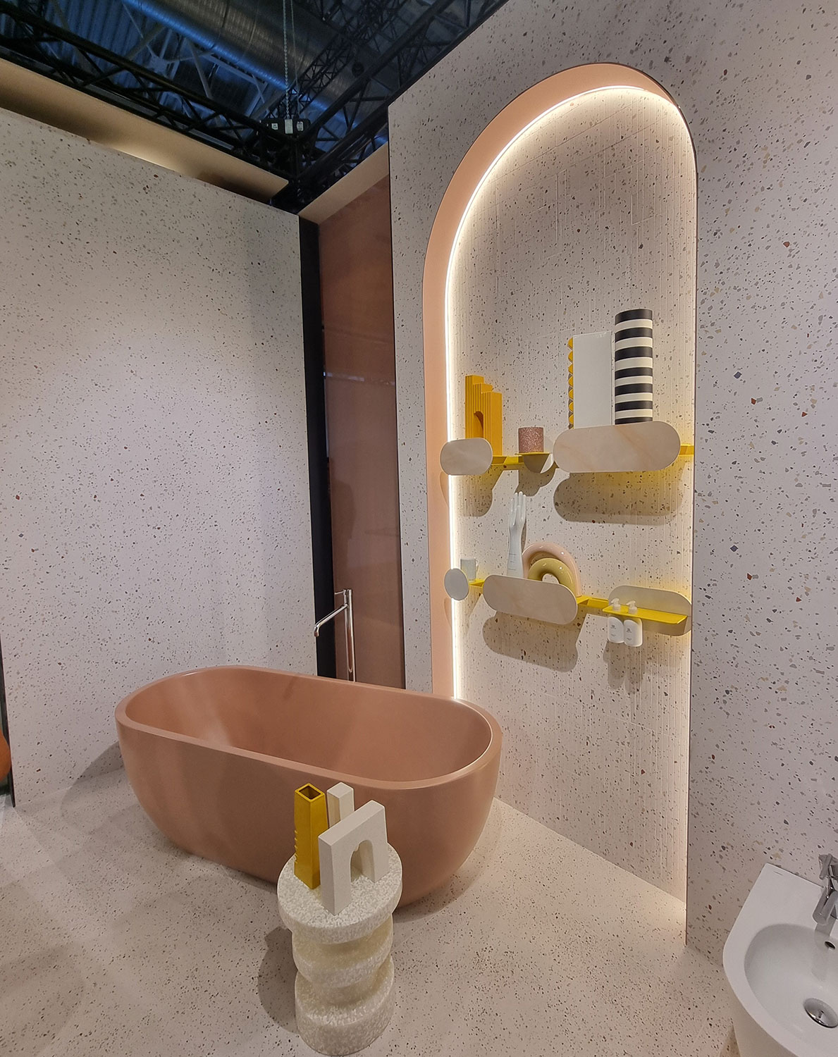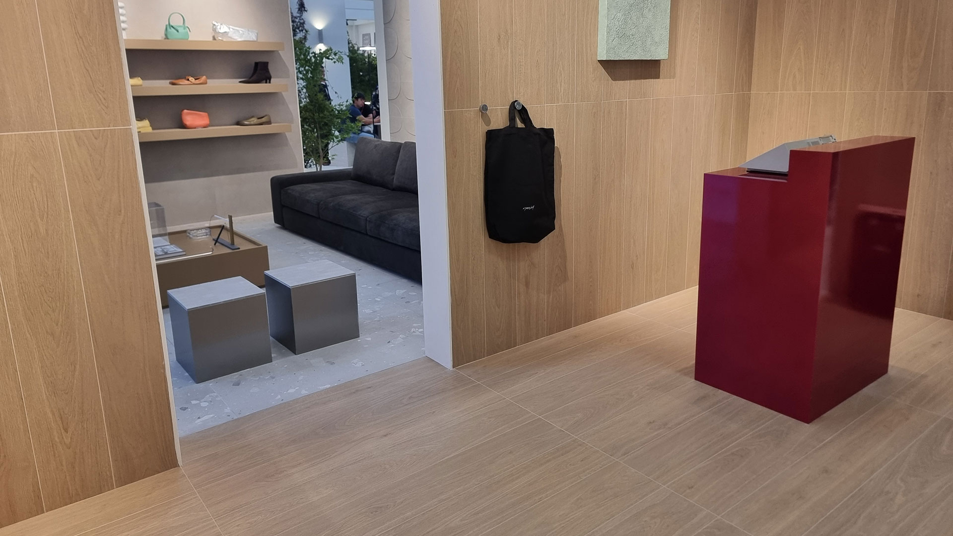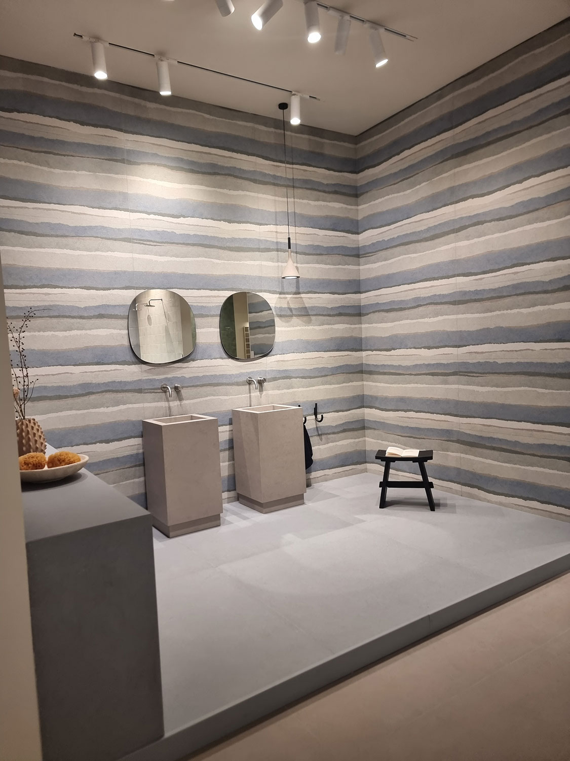 Del Conca turns 90° with horizontal stripes throughout the stand, soft and organic like geological stratification. It will be a long trend: stripes are an ultra-versatile evergreen, they personalize while remaining sober, they are not demanding and divisive like a designed decoration.