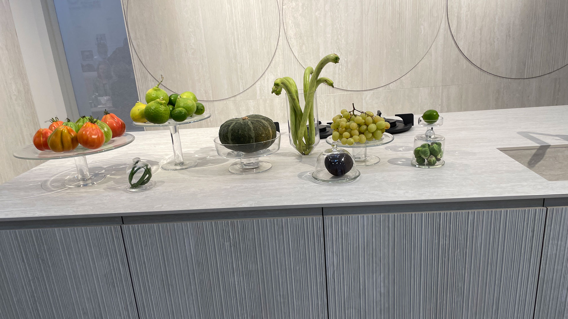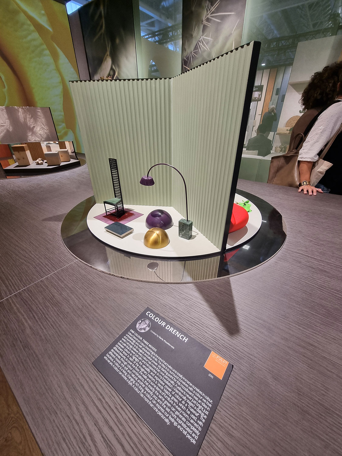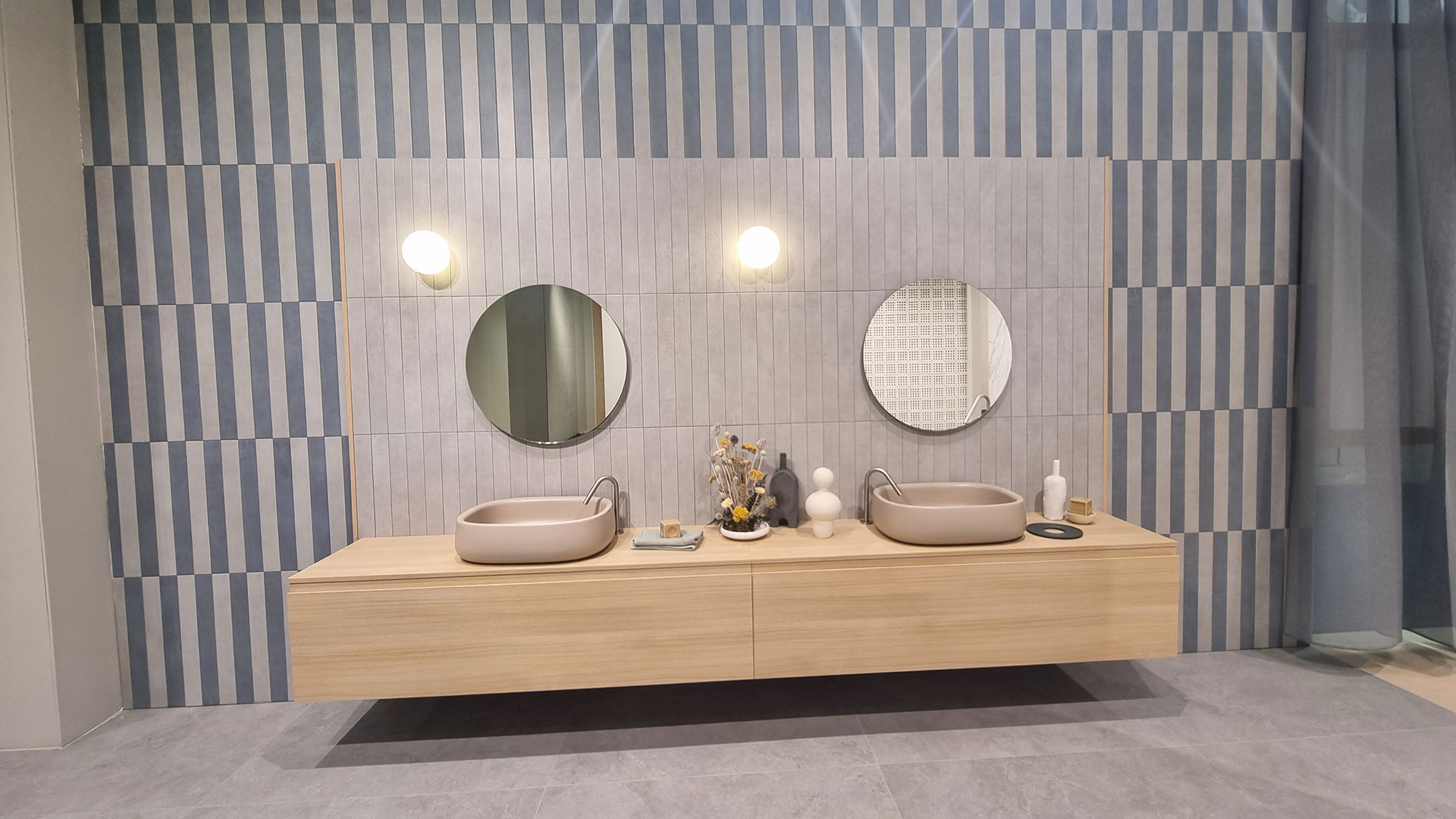 Del Conca turns 90° with horizontal stripes throughout the stand, soft and organic like geological stratification. It will be a long trend: stripes are an ultra-versatile evergreen, they personalize while remaining sober, they are not demanding and divisive like a designed decoration.