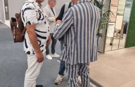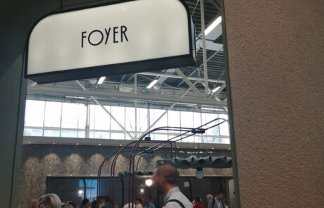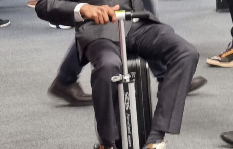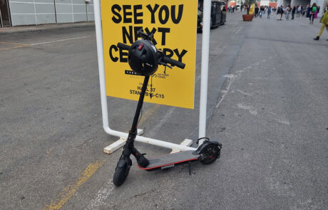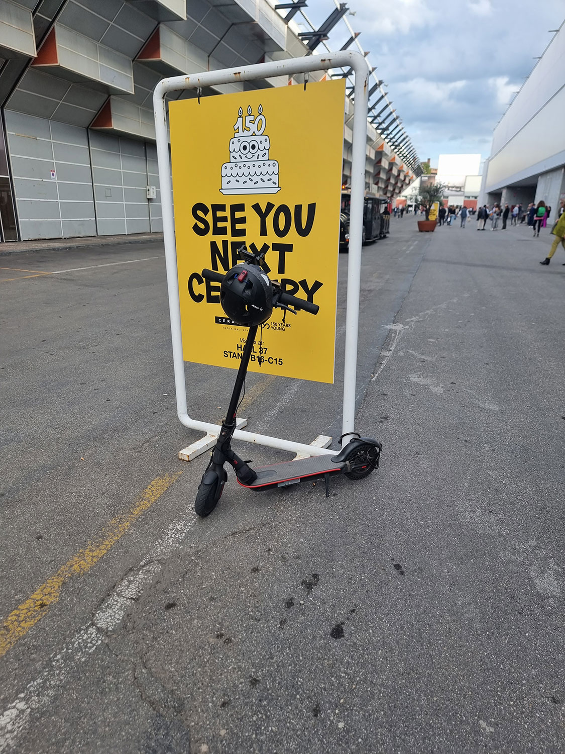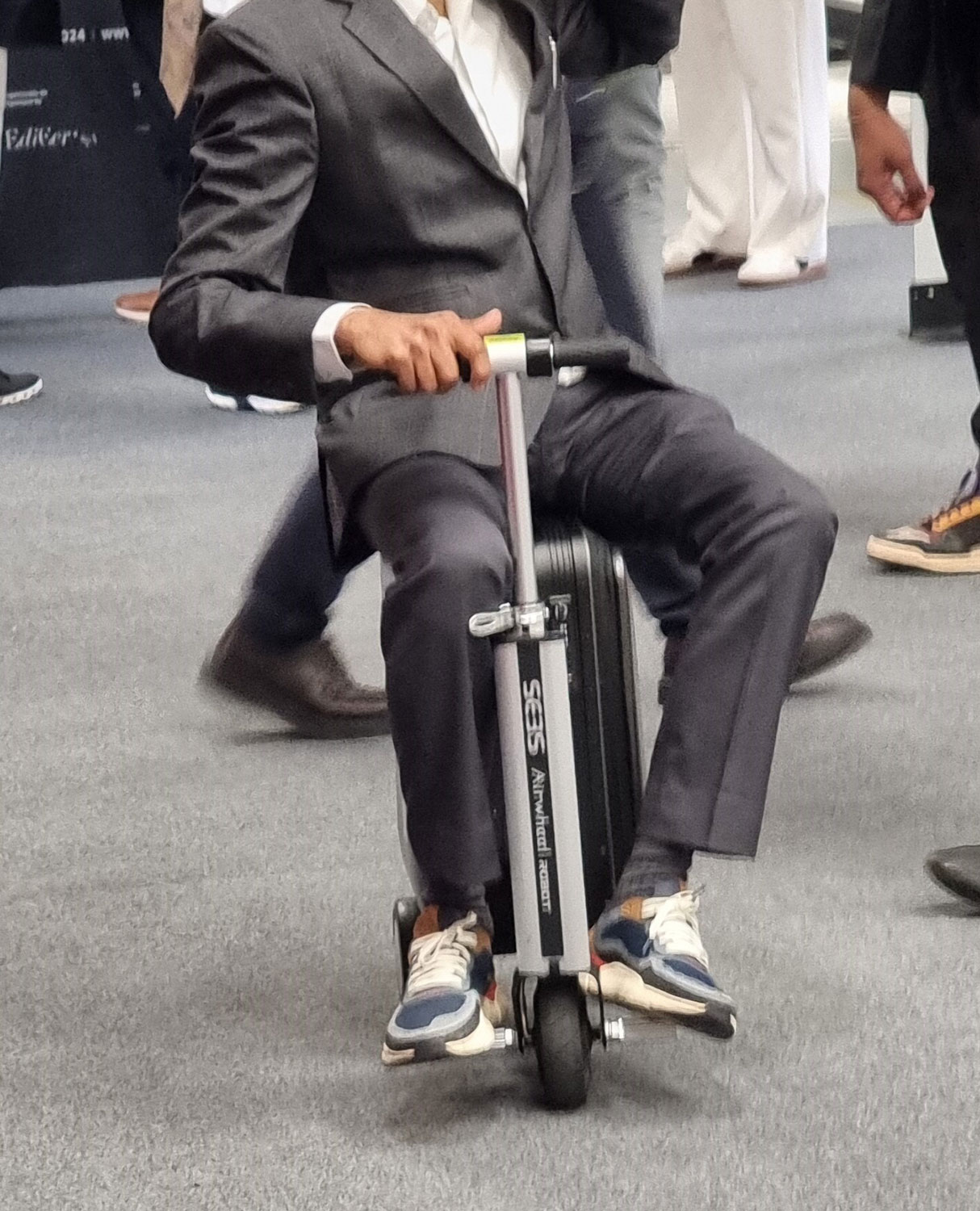 For us, the 2024 Cersaie Hero award goes to the self-propelled electric suitcase, simply amazing. Who knows if charging is done on Tesla columns or at smartphone charge points. The Disneyland train team incessantly circumnavigates the fair district, the carriages are packed with joyful commuters, like the Tokyo subway. Traffic is heavy, we witnessed a collision between the passenger train and the waste train.
