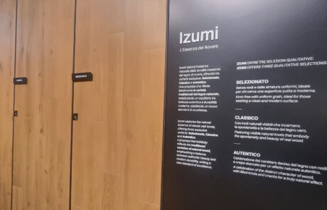 Isla (Legni d’Italia) explores mixed essences. Atlas Concorde proposes Cansei: not the bad girl from Games of Thrones but a D.o.p. beech from the Cansiglio forest, with specimens chosen by an authentic parquettista and comparison with the porcelain replica (a reference to the unforgettable “couple” real marble/porcelain marble). Rondine presents a hard and dark plank and also a mega-chevron (herringbone).