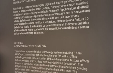 The majority of Made in Italy churns out authentically material “advanced surfaces”, which synchronize digital printing (a commodity) with fine work on the material and finish that distinguishes and enhances Sassuolo IGP ceramics.